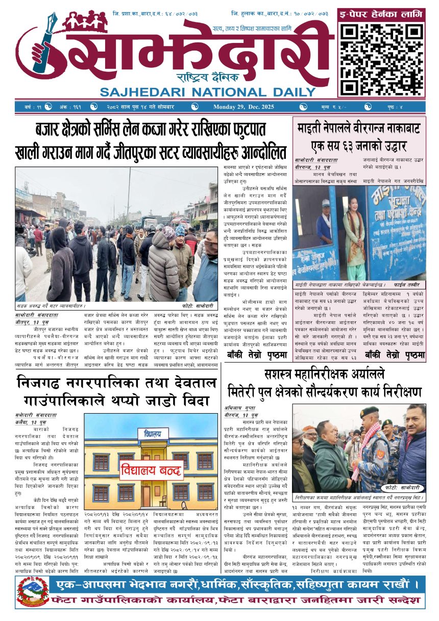 ई–पेपर २०८२ पुस १४ गते । साझेदारी दैनिक साझेदारी दैनिक २०८२ पुष १४, गते 252 पाठक संख्या शेयर शेयर Leave a review Leave a review Leave a Review Cancel replyYour email address will not be published. Required fields are marked * Please select a rating! Your Rating Rate… Perfect Good Average Not that Bad Very Poor Your Comment *नाम * Your Email * Your website Save my name, email, and website in this browser for the next time I comment. ताजा अपडेट दुर्घटना न्यूनीकरणलाई केन्द्रमा राखेर काम गर्न डीआईजी थपलियाको निर्देशन मधेश मुख्य समाचार समाचार कलैयामा घरको ताला तोडेर करिब ५० लाख बराबरको चोरी मधेश मुख्य समाचार समाचार प्रधानमन्त्री कप क्रिकेटको उपाधि त्रिभुवन आर्मी क्लबलाई खेलकुद मधेश मुख्य समाचार समाचार लागुऔषधसहित विभिन्न स्थानबाट २४ जना पक्राउ प्रदेश समाचार समाचार सुनचाँदीको मूल्य घट्यो समाचार भन्सार छली प्रकरणः तीन जनाविरुद्ध अदालतमा मुद्दा, मुख्य अभियुक्तबाट २ करोडभन्दा बढी बिगो दाबी मधेश मुख्य समाचार समाचार जीतपुरको गौशाला जग्गा अतिक्रमण घरटहरा हटाइयो मधेश मुख्य समाचार समाचार मुख्य समाचार बारामा भूतपूर्व सैनिक पुनर्मिलन कार्यक्रम सम्पन्न मधेश समाचार पाँच पटक भन्दाबढी ट्राफिक नियम उल्लंघन गर्नेको लाइसेन्स निलम्बन प्रक्रिया सुरु मधेश मुख्य समाचार समाचार बाराका दुई नगरपालिकामा नयाँ प्रमुख प्रशासकीय अधिकृत खटाइए मधेश मुख्य समाचार समाचार पर्सामा नागरिकतासँगै राष्ट्रिय परिचयपत्र मधेश मुख्य समाचार समाचार राजश्व अनुसन्धान कार्यालय पथलैयामा आगलागी, प्रमुखको कार्यकक्ष ध्वस्त मधेश समाचार प्रदेश समाचार भाडा वृद्धि पछि सिमरा-काठमाडौं उडानमा यात्रु घटे मधेश मुख्य समाचार समाचार बारामा साढे दुई महिनामा एक करोडभन्दा बढीको अवैध सामान बरामद मधेश मुख्य समाचार समाचार सांसद साहलाई जीतपुरसिमरा-१७ का वडाबासीद्वारा ध्यानाकर्षणपत्र बुझाइयो मधेश मुख्य समाचार समाचार प्रधानमन्त्री कपको आजको खेलमा मधेस प्रदेश विजयी खेलकुद मधेश समाचार स्थानीय तहसँग मागियो विद्यालय समायोजनको विवरण प्रदेश समाचार समाचार