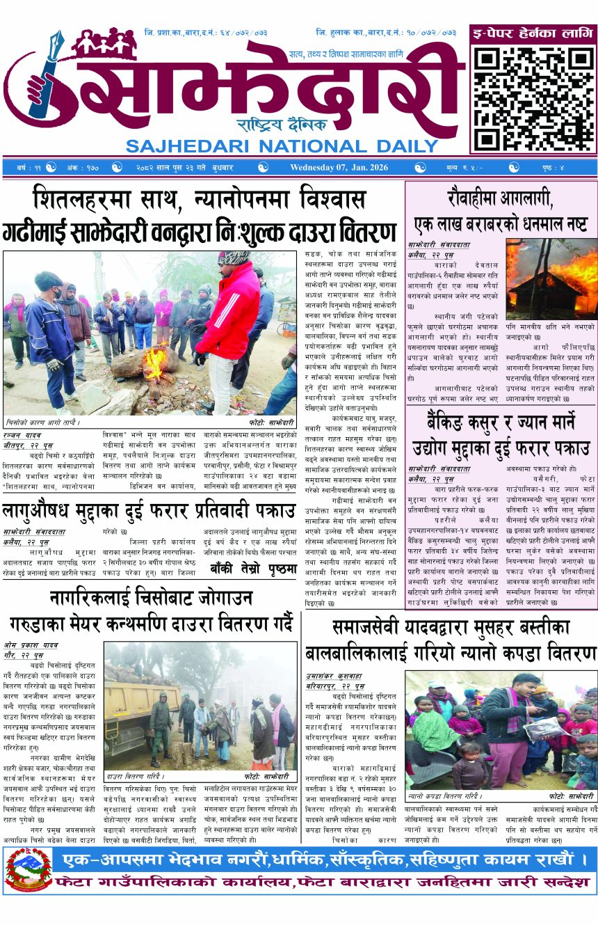 ई–पेपर २०८२ पुस २३ गते । साझेदारी दैनिक साझेदारी दैनिक २०८२ पुष २३, गते 142 पाठक संख्या शेयर शेयर Leave a review Leave a review Leave a Review Cancel replyYour email address will not be published. Required fields are marked * Please select a rating! Your Rating Rate… Perfect Good Average Not that Bad Very Poor Your Comment *नाम * Your Email * Your website Save my name, email, and website in this browser for the next time I comment. ताजा अपडेट सुनसरीमा काँचो केरासहित चार जना पक्राउ मधेश मुख्य समाचार समाचार २०८३ वैशाख ०५ गते । साझेदारी दैनिक ई–पेपर दुर्घटना न्यूनीकरणलाई केन्द्रमा राखेर काम गर्न डीआईजी थपलियाको निर्देशन मधेश मुख्य समाचार समाचार कलैयामा घरको ताला तोडेर करिब ५० लाख बराबरको चोरी मधेश मुख्य समाचार समाचार प्रधानमन्त्री कप क्रिकेटको उपाधि त्रिभुवन आर्मी क्लबलाई खेलकुद मधेश मुख्य समाचार समाचार लागुऔषधसहित विभिन्न स्थानबाट २४ जना पक्राउ प्रदेश समाचार समाचार सुनचाँदीको मूल्य घट्यो समाचार मुख्य समाचार भन्सार छली प्रकरणः तीन जनाविरुद्ध अदालतमा मुद्दा, मुख्य अभियुक्तबाट २ करोडभन्दा बढी बिगो दाबी मधेश मुख्य समाचार समाचार जीतपुरको गौशाला जग्गा अतिक्रमण घरटहरा हटाइयो मधेश मुख्य समाचार समाचार बारामा भूतपूर्व सैनिक पुनर्मिलन कार्यक्रम सम्पन्न मधेश समाचार पाँच पटक भन्दाबढी ट्राफिक नियम उल्लंघन गर्नेको लाइसेन्स निलम्बन प्रक्रिया सुरु मधेश मुख्य समाचार समाचार बाराका दुई नगरपालिकामा नयाँ प्रमुख प्रशासकीय अधिकृत खटाइए मधेश मुख्य समाचार समाचार प्रदेश समाचार पर्सामा नागरिकतासँगै राष्ट्रिय परिचयपत्र मधेश मुख्य समाचार समाचार राजश्व अनुसन्धान कार्यालय पथलैयामा आगलागी, प्रमुखको कार्यकक्ष ध्वस्त मधेश समाचार भाडा वृद्धि पछि सिमरा-काठमाडौं उडानमा यात्रु घटे मधेश मुख्य समाचार समाचार बारामा साढे दुई महिनामा एक करोडभन्दा बढीको अवैध सामान बरामद मधेश मुख्य समाचार समाचार सांसद साहलाई जीतपुरसिमरा-१७ का वडाबासीद्वारा ध्यानाकर्षणपत्र बुझाइयो मधेश मुख्य समाचार समाचार