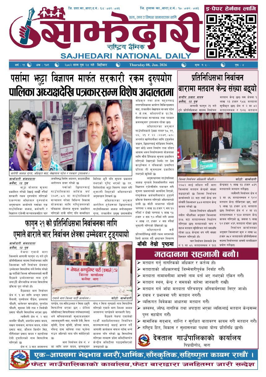 ई–पेपर २०८२ पुस २४ गते । साझेदारी दैनिक साझेदारी दैनिक २०८२ पुष २४, गते 242 पाठक संख्या शेयर शेयर Leave a review Leave a review Leave a Review Cancel replyYour email address will not be published. Required fields are marked * Please select a rating! Your Rating Rate… Perfect Good Average Not that Bad Very Poor Your Comment *नाम * Your Email * Your website Save my name, email, and website in this browser for the next time I comment. ताजा अपडेट रास्वपाको महामन्त्रीमा शाह मनोनित राजनीति समाचार पहिलेको निर्णय फेरियो : कलैयामा अब वैशाख १६ देखि कक्षा सुरु हुने मधेश मुख्य समाचार समाचार कलैयामा वैशाख १५ गतेदेखि भर्ना अभियान, २१ गतेदेखि पठनपाठन सुरु हुने मधेश मुख्य समाचार समाचार पेट्रोलियम पदार्थमा गरिएको मूल्य वृद्धि फिर्ता लिन अध्यक्ष घिसिङको माग समाचार पर्सा राष्ट्रिय निकुञ्जमा वन्यजन्तु उद्धार केन्द्र उद्घाटन मधेश समाचार कलैयामा खसी मासुको छालासहित र बिना छालाको छुट्टाछुट्टै मूल्य निर्धारण मधेश समाचार सिम्रौनगढमा छाडा कुकुरको आतंक : एकै घरका ८ खसी-बाख्रा मरे मधेश मुख्य समाचार समाचार मुख्य समाचार रेल्वे सेवा ७९ करोड ऋणमा मधेश समाचार सडक विस्तारले वीरगञ्जको विद्युत् अवरुद्ध मधेश मुख्य समाचार समाचार बाईपास विस्तारका लागि २४ घण्टाभित्र संरचना हटाउन वीरगञ्ज महानगरको निर्देशन मधेश मुख्य समाचार समाचार वीरगञ्जमा भर्ना अभियान वैशाख ७ गतेदेखि सुरु हुने मधेश समाचार वीरगन्जमा अतिक्रमित संरचना भत्काउन सुरु मधेश मुख्य समाचार समाचार प्रदेश समाचार जीतपुरसिमराको बिद्यालयमा पठनपाठन वैशाख १४ गते देखि सुरु हुने मधेश मुख्य समाचार समाचार करैयामाई -६ सिहोर्वामा नि:शुल्क स्वास्थ्य शिविर सम्पन्न मधेश समाचार स्वास्थ्य बारामा खेतबाट घर फर्किँदै गर्दा चट्याङ लागेर एक जनाको मृत्यु मधेश मुख्य समाचार समाचार बृन्दावनमा ६ सुकुम्बासी परिवार विस्थापित मधेश समाचार सुनसरीमा काँचो केरासहित चार जना पक्राउ मधेश मुख्य समाचार समाचार
