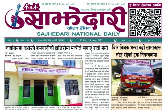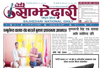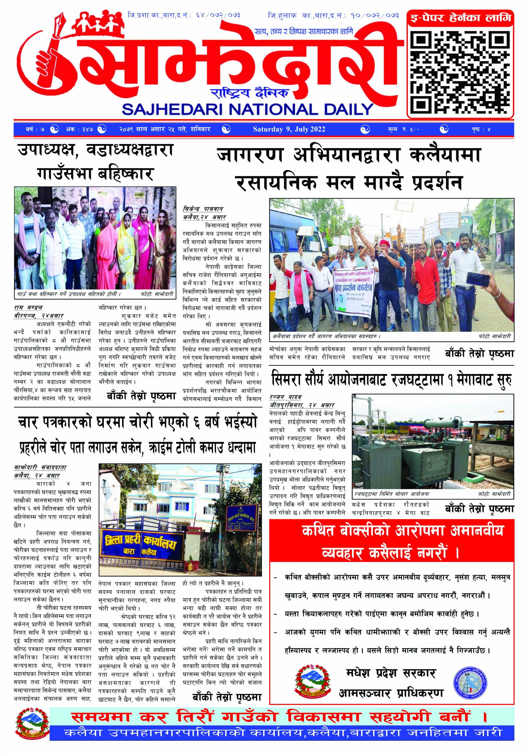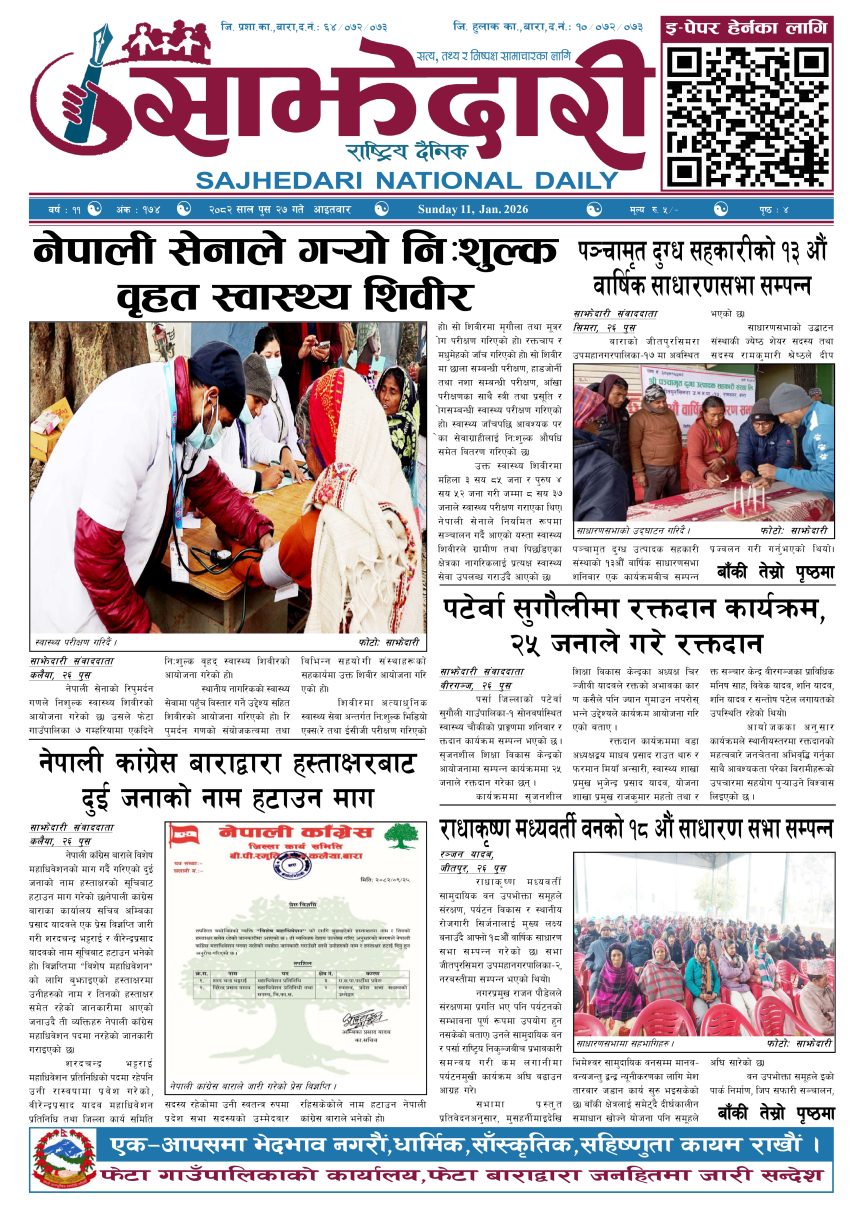 ई–पेपर २०८२ पुस २७ गते । साझेदारी दैनिक साझेदारी दैनिक २०८२ पुष २७, गते 218 पाठक संख्या शेयर शेयर Leave a review Leave a review Leave a Review Cancel replyYour email address will not be published. Required fields are marked * Please select a rating! Your Rating Rate… Perfect Good Average Not that Bad Very Poor Your Comment *नाम * Your Email * Your website Save my name, email, and website in this browser for the next time I comment. ताजा अपडेट लागुऔषधसहित विभिन्न स्थानबाट २४ जना पक्राउ प्रदेश समाचार समाचार सुनचाँदीको मूल्य घट्यो समाचार भन्सार छली प्रकरणः तीन जनाविरुद्ध अदालतमा मुद्दा, मुख्य अभियुक्तबाट २ करोडभन्दा बढी बिगो दाबी मधेश मुख्य समाचार समाचार जीतपुरको गौशाला जग्गा अतिक्रमण घरटहरा हटाइयो मधेश मुख्य समाचार समाचार बारामा भूतपूर्व सैनिक पुनर्मिलन कार्यक्रम सम्पन्न मधेश समाचार २०८३ वैशाख ०४ गते । साझेदारी दैनिक ई–पेपर पाँच पटक भन्दाबढी ट्राफिक नियम उल्लंघन गर्नेको लाइसेन्स निलम्बन प्रक्रिया सुरु मधेश मुख्य समाचार समाचार मुख्य समाचार बाराका दुई नगरपालिकामा नयाँ प्रमुख प्रशासकीय अधिकृत खटाइए मधेश मुख्य समाचार समाचार पर्सामा नागरिकतासँगै राष्ट्रिय परिचयपत्र मधेश मुख्य समाचार समाचार राजश्व अनुसन्धान कार्यालय पथलैयामा आगलागी, प्रमुखको कार्यकक्ष ध्वस्त मधेश समाचार भाडा वृद्धि पछि सिमरा-काठमाडौं उडानमा यात्रु घटे मधेश मुख्य समाचार समाचार बारामा साढे दुई महिनामा एक करोडभन्दा बढीको अवैध सामान बरामद मधेश मुख्य समाचार समाचार प्रदेश समाचार सांसद साहलाई जीतपुरसिमरा-१७ का वडाबासीद्वारा ध्यानाकर्षणपत्र बुझाइयो मधेश मुख्य समाचार समाचार प्रधानमन्त्री कपको आजको खेलमा मधेस प्रदेश विजयी खेलकुद मधेश समाचार स्थानीय तहसँग मागियो विद्यालय समायोजनको विवरण प्रदेश समाचार समाचार होटेल करण राज प्यालेसमा आधुनिक सुविधासहित स्विमिङ पुल उद्घाटन मधेश मुख्य समाचार समाचार रिलायन्स सुगर एण्ड केमिकल इन्डस्ट्रिजद्वारा उखु क्रसिङ सिजन समापन मधेश मुख्य समाचार समाचार