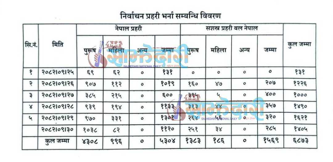 समग्रमा नेपाल प्रहरीतर्फ पुरुष ४ हजार ३ सय ८, महिला ९ सय ९६, सशस्त्र प्रहरीतर्फ पुरुष एक हजार ३ सय ८३, महिला एक सय ८६ जना गरी जम्मा ६ हजार ८ सय ७३ जनाले आवेदन दिएको डिएसपी पण्डितले जानाकारी दिए ।