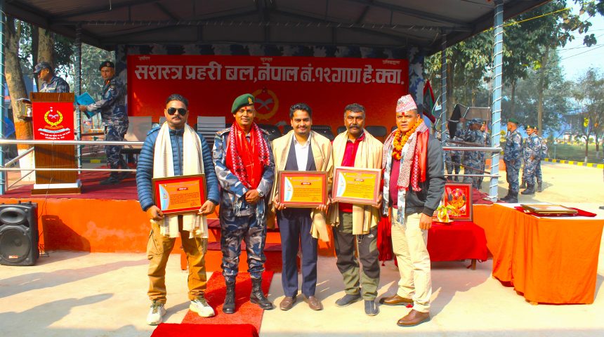 उक्त योगदानको उच्च मूल्याङ्कन गर्दै यो प्रशंसा पत्र प्रदान गरिएको छ । तपाईंको आगामी पेशागत यात्रा अझ सफल, सम्मानित र प्रभावकारी बनोस् भन्ने शुभकामनासहित उत्तरोत्तर प्रगतिको कामना गर्दछु भनी गणपति सशस्त्र प्रहरी उपरीक्षक खुम बहादुर केसीले प्रशंसा पत्र प्रदान गरेका हुन् । त्यसैगरी मुन्ना डिजिटल भिडियोग्राफी कलैयाका मुन्ना साह पनि सम्मानित भएका छन् ।
