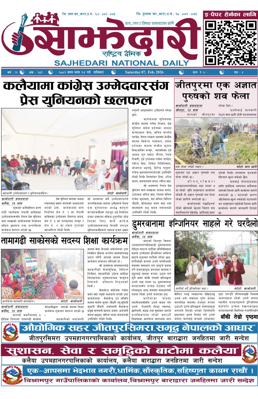 ई–पेपर २०८२ माघ २४ गते । साझेदारी दैनिक साझेदारी डेलि २०८२ माघ २४, गते 180 पाठक संख्या शेयर Leave a review Leave a review Leave a Review Cancel replyYour email address will not be published. Required fields are marked * Please select a rating! Your Rating Rate… Perfect Good Average Not that Bad Very Poor Your Comment *नाम * Your Email * Your website Save my name, email, and website in this browser for the next time I comment. ताजा अपडेट जिल्लास्तरीय हाजिरी जवाफ प्रतियोगिता सम्पन्न मधेश समाचार रौतहट-४ मा रास्वपाका पौडेल विजयी निर्वाचन अपडेट मधेश समाचार बारा -१ मा रास्वपाका गणेश धिमाल निर्वाचित निर्वाचन अपडेट मधेश मुख्य समाचार समाचार सर्लाही–४ मा रास्वपाको अग्रता कायम मधेश समाचार गोरखा-१ मा रास्वपाका सुधन गुरुङको सुरुआती अग्रता गण्डकी समाचार रौतहट–१ बाट रास्वपाका राजेश चौधरी भारी मतान्तरले विजयी, माधव चौथो स्थानमा निर्वाचन अपडेट मधेश समाचार पर्सा-२ मा रास्वपाका कानु विजयी निर्वाचन अपडेट मधेश मुख्य समाचार राजनीति समाचार मुख्य समाचार पर्सा–१ बाट रास्वापाका पन्त विजयी मधेश राजनीति बारा–३ मा रास्वपाका अरविन्द साह भारी मतान्तरसहित विजयी मधेश मुख्य समाचार समाचार धनुषा–३ बाट रास्वपाका मनिष झा निर्वाचित मधेश मुख्य समाचार समाचार प्रतिनिधिसभा मतगणना : बारामा रास्वपाको अग्रता कायम निर्वाचन अपडेट मधेश मुख्य समाचार समाचार पर्साको २ मा कानुको अग्रता दोब्बरले बढ्यो निर्वाचन अपडेट मधेश राजनीति समाचार प्रदेश समाचार पर्साको चारै क्षेत्रमा रास्वपाको अग्रता मधेश राजनीति समाचार प्रतिनिधिसभा मतगणना : बाराका चारै क्षेत्रमा रास्वपा अगाडि निर्वाचन अपडेट मधेश मुख्य समाचार राजनीति समाचार बारा-३ मा रास्वपाका अरविन्द साहको अग्रता मधेश मुख्य समाचार समाचार बारा-३ मा भोलिदेखि मतगणना सुरु हुने, मतपेटिका रुजु गर्ने कार्य जारी मधेश मुख्य समाचार समाचार रौतहटमा आज रातिदेखि नै मतगणना गरिने मधेश समाचार