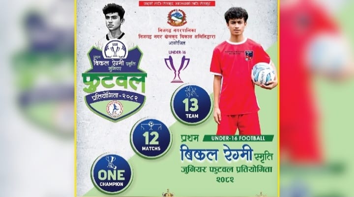 निजगढ : निजगढमा दोस्रो ‘विकल रेग्मी स्मृति जुनियर फुटबल प्रतियोगिता’ आयोजना हुने भएको छ। निजगढ नगरपालिकाको नगर खेलकुद विकास समितिको आयोजनामा हुने उक्त प्रतियोगिताको व्यवस्थापन निजगढ फुटबल क्लबले गर्नेछ।