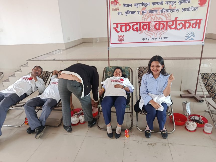 बारा : नेपाल बहुराष्ट्रिय कम्पनी मजदुर युनियनको आयोजनामा सूर्य नेपाल परिसरमा फागुन ११ गते रक्तदान कार्यक्रम सम्पन्न भएको छ। कार्यक्रममा ५ जना महिलासहित कुल ६३ जनाले रक्तदान गरेका छन्।