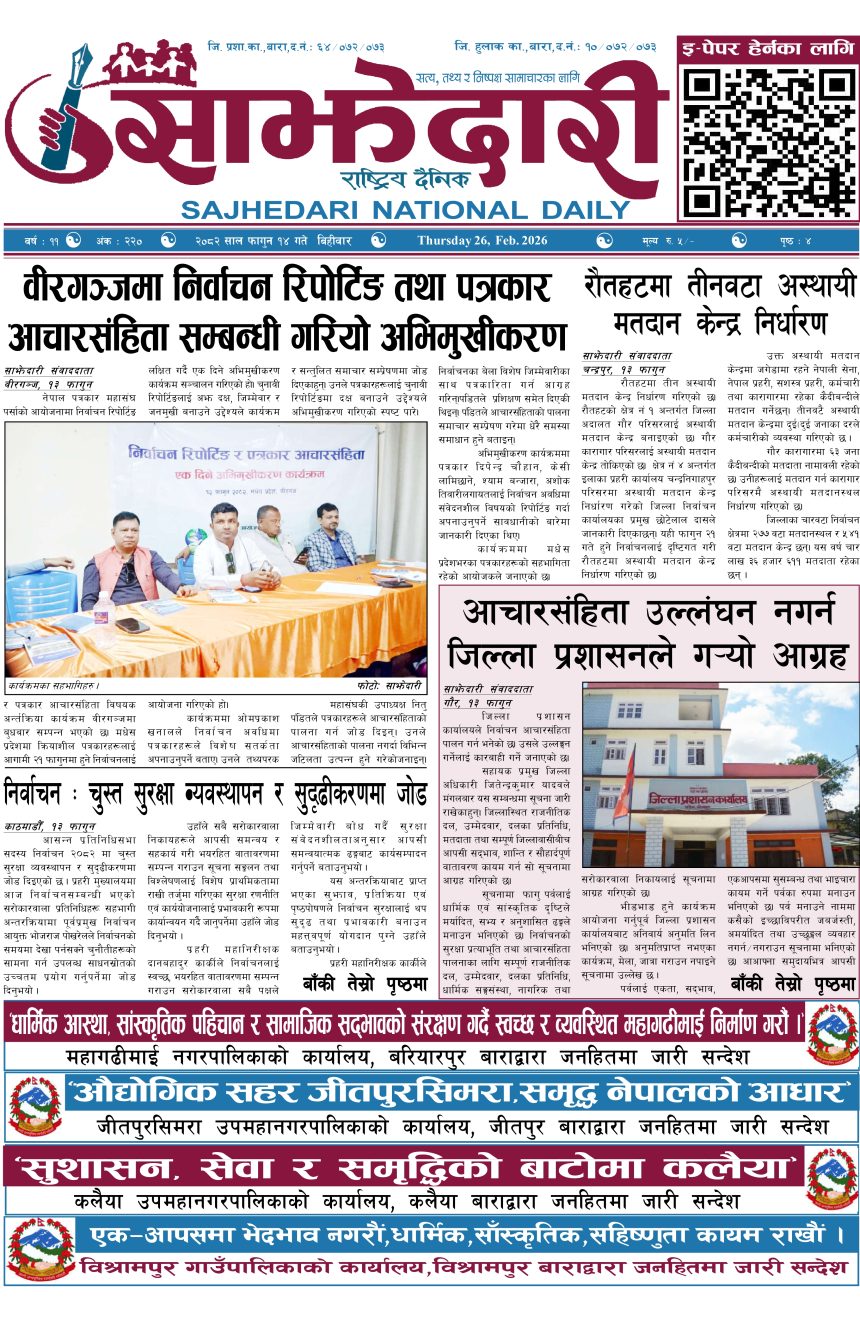 ई–पेपर २०८२ फागुन १४ गते । साझेदारी दैनिक संदिप प्रसाद यादव २०८२ फाल्गुन १४, गते 277 पाठक संख्या शेयर शेयर Leave a review Leave a review Leave a Review Cancel replyYour email address will not be published. Required fields are marked * Please select a rating! Your Rating Rate… Perfect Good Average Not that Bad Very Poor Your Comment *नाम * Your Email * Your website Save my name, email, and website in this browser for the next time I comment. ताजा अपडेट होटेल करण राज प्यालेसमा आधुनिक सुविधासहित स्विमिङ पुल उद्घाटन मधेश मुख्य समाचार समाचार रिलायन्स सुगर एण्ड केमिकल इन्डस्ट्रिजद्वारा उखु क्रसिङ सिजन समापन मधेश मुख्य समाचार समाचार सिरहाको सलहेश फूलबारीमा भक्तजनको घुइँचो मधेश समाचार प्रसौनीमा ३ करोड भन्दा बढीको लागतमा विद्यालय–पुस्तकालय भवन निर्माण हुदै मधेश समाचार अवैध बिटौरी कर असुलीविरुद्ध प्रसौनीमा प्रदर्शन, छानबिनको माग मधेश मुख्य समाचार समाचार २०८३ वैशाख ०१ गते । साझेदारी दैनिक ई–पेपर प्रधानमन्त्री कप क्रिकेटः मधेसलाई पराजित गर्दै एपिएफ विजयी खेलकुद मधेश समाचार मुख्य समाचार पर्सामा लागुऔषध गाँजाजस्तो देखिने पदार्थसहित एक जना पक्राउ मधेश समाचार चौरसिया हत्या प्रकरणमा चार जना पक्राउ मधेश मुख्य समाचार समाचार रोकिएन राजमार्गमा ढाट राखेर सङ्कलन गरिने अवैध कर मधेश समाचार बारामा एसईईको उत्तरपुस्तिका परीक्षण कार्य सम्पन्न, नतिजा आजै बोर्डमा पठाइँदै मधेश मुख्य समाचार समाचार बकुलिया विद्यालयमा सामाजिक परीक्षण कार्यक्रम सम्पन्न मधेश समाचार प्रदेश समाचार प्रेस युनियनद्धारा स्थानीय मिडिया बचाउन सरकारसंग नीतिगत स्पष्टता ल्याउन माग मधेश मुख्य समाचार समाचार उन्नाइस केजी गाँजासहित युवक पक्राउ मधेश समाचार रौतहटमा नागरिक सुनुवाइ कार्यक्रम सम्पन्न मधेश मुख्य समाचार समाचार रास्वपा सदस्यले गल्ति गरे कारवाही हुन्छ : मधेस प्रदेश सभापति यादव मधेश मुख्य समाचार राजनीति समाचार जेनजी युथ अफ बाराद्वारा प्रादेशिक अस्पताल कलैयामा बृहत् सरसफाइ मधेश समाचार स्वास्थ्य