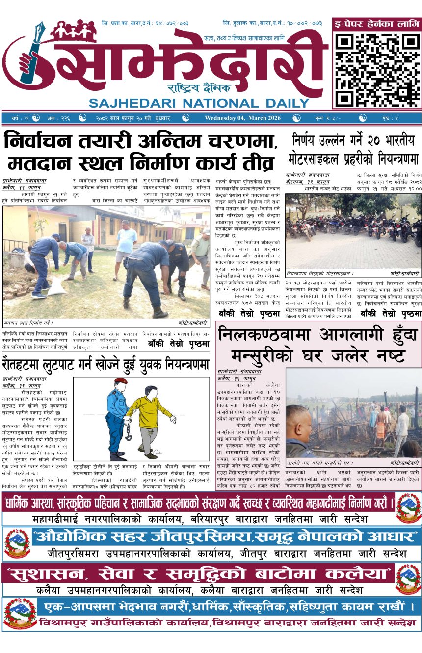 ई–पेपर २०८२ फागुन २० गते । साझेदारी दैनिक संदिप प्रसाद यादव २०८२ फाल्गुन २०, गते 175 पाठक संख्या शेयर शेयर Leave a review Leave a review Leave a Review Cancel replyYour email address will not be published. Required fields are marked * Please select a rating! Your Rating Rate… Perfect Good Average Not that Bad Very Poor Your Comment *नाम * Your Email * Your website Save my name, email, and website in this browser for the next time I comment. ताजा अपडेट मन्त्रिपरिषद बैठक बस्दै समाचार हावाहुरी र असिनाले निलकण्ठवामा ३ घरमा क्षति मधेश मुख्य समाचार समाचार २०८३ वैशाख १४ गते । साझेदारी दैनिक ई–पेपर रौतहटमा गुणस्तरहीन निर्माण कार्य भएको भन्दै स्थानीयद्वारा विरोध ,काका ठेकेदार भतिजा ईन्जिनियर मधेश मुख्य समाचार समाचार गण्डक नहर किनारका अतिक्रमित संरचना हटाउन थालियो मधेश समाचार कलैया : बसपार्कबाटै सवारी चलाउने निर्णय अझै कार्यान्वयन भएन मधेश मुख्य समाचार समाचार सुनचाँदीको मुल्य आज बढ्यो समाचार मुख्य समाचार खुला नाकाबाट सोझै वीरगन्ज भित्रिन्छ भारतीय तरकारी मधेश समाचार मधुवनमा काठसहित एक जना पक्राउ मधेश समाचार सेज क्षेत्रको अतिक्रमण हटाउने प्रक्रिया तीव्र हुँदै,५ सय बिघा जमिन फिर्ता लिन सरकारको दबाब मधेश मुख्य समाचार समाचार कलवारको नेतृत्वमा शान्ति युवा मञ्चको नयाँ समिति गठन मधेश समाचार अत्याधिक गर्मीलाई मध्यनजर गर्दै कलैयामा निःशुल्क पानी र शरबत वितरण मधेश समाचार प्रदेश समाचार कलैयामा अब सबै रुटका सवारी बसपार्कबाट मात्र सञ्चालन हुने मधेश मुख्य समाचार समाचार बिजुली, पानी र विवाह रकम भुक्तानीको माग गर्दै मौलापुर नगरपालिकाविरुद्ध आन्दोलन घोषणा मधेश समाचार थापाथलीको सुकुमबासी बस्ती खाली गरियो बागमती समाचार वीरगञ्जबाट पेट्रोलियम आयात, साठी अर्ब अठतीस करोड राजस्व सङ्कलन मधेश समाचार पथलैयामा ओभरलोड सवारीमाथि एक्सनः दुई दिनमै ६ गाडी कारवाहीमा मधेश मुख्य समाचार समाचार