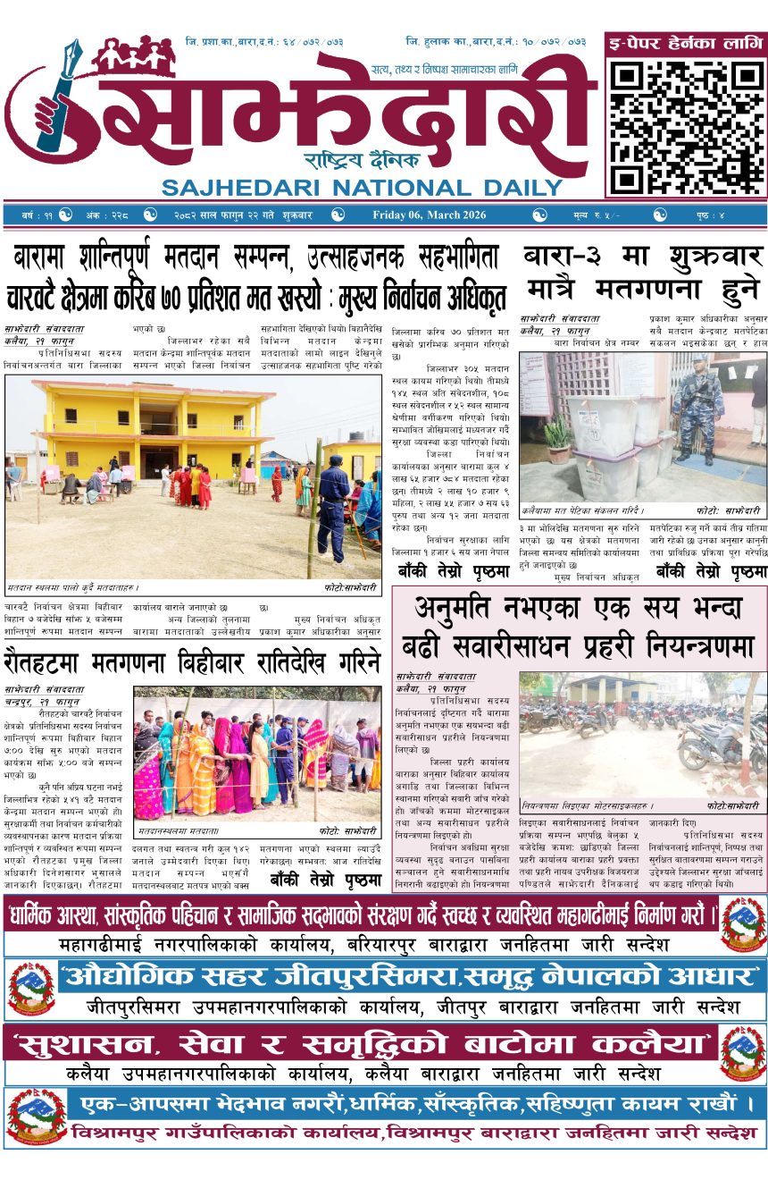 ई–पेपर २०८२ फागुन २२ गते । साझेदारी दैनिक संदिप प्रसाद यादव २०८२ फाल्गुन २२, गते 170 पाठक संख्या शेयर शेयर Leave a review Leave a review Leave a Review Cancel replyYour email address will not be published. Required fields are marked * Please select a rating! Your Rating Rate… Perfect Good Average Not that Bad Very Poor Your Comment *नाम * Your Email * Your website Save my name, email, and website in this browser for the next time I comment. ताजा अपडेट रौतहटमा गुणस्तरहीन निर्माण कार्य भएको भन्दै स्थानीयद्वारा विरोध ,काका ठेकेदार भतिजा ईन्जिनियर मधेश मुख्य समाचार समाचार गण्डक नहर किनारका अतिक्रमित संरचना हटाउन थालियो मधेश समाचार कलैया : बसपार्कबाटै सवारी चलाउने निर्णय अझै कार्यान्वयन भएन मधेश मुख्य समाचार समाचार सुनचाँदीको मुल्य आज बढ्यो समाचार मनोहरा सुकुमवासी बस्तीमा घरटहरा भत्काउन सुरु समाचार खुला नाकाबाट सोझै वीरगन्ज भित्रिन्छ भारतीय तरकारी मधेश समाचार मधुवनमा काठसहित एक जना पक्राउ मधेश समाचार मुख्य समाचार सेज क्षेत्रको अतिक्रमण हटाउने प्रक्रिया तीव्र हुँदै,५ सय बिघा जमिन फिर्ता लिन सरकारको दबाब मधेश मुख्य समाचार समाचार कलवारको नेतृत्वमा शान्ति युवा मञ्चको नयाँ समिति गठन मधेश समाचार अत्याधिक गर्मीलाई मध्यनजर गर्दै कलैयामा निःशुल्क पानी र शरबत वितरण मधेश समाचार कलैयामा अब सबै रुटका सवारी बसपार्कबाट मात्र सञ्चालन हुने मधेश मुख्य समाचार समाचार बिजुली, पानी र विवाह रकम भुक्तानीको माग गर्दै मौलापुर नगरपालिकाविरुद्ध आन्दोलन घोषणा मधेश समाचार प्रदेश समाचार थापाथलीको सुकुमबासी बस्ती खाली गरियो बागमती समाचार वीरगञ्जबाट पेट्रोलियम आयात, साठी अर्ब अठतीस करोड राजस्व सङ्कलन मधेश समाचार पथलैयामा ओभरलोड सवारीमाथि एक्सनः दुई दिनमै ६ गाडी कारवाहीमा मधेश मुख्य समाचार समाचार सुकुम्वासी मोर्चाका कार्यवाहक अध्यक्ष परियार पक्राउ बागमती समाचार भूमिहीनलाई ३० दिनभित्र विवरण पेश गर्न वीरगञ्ज महानगरको सूचना मधेश समाचार