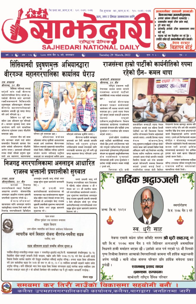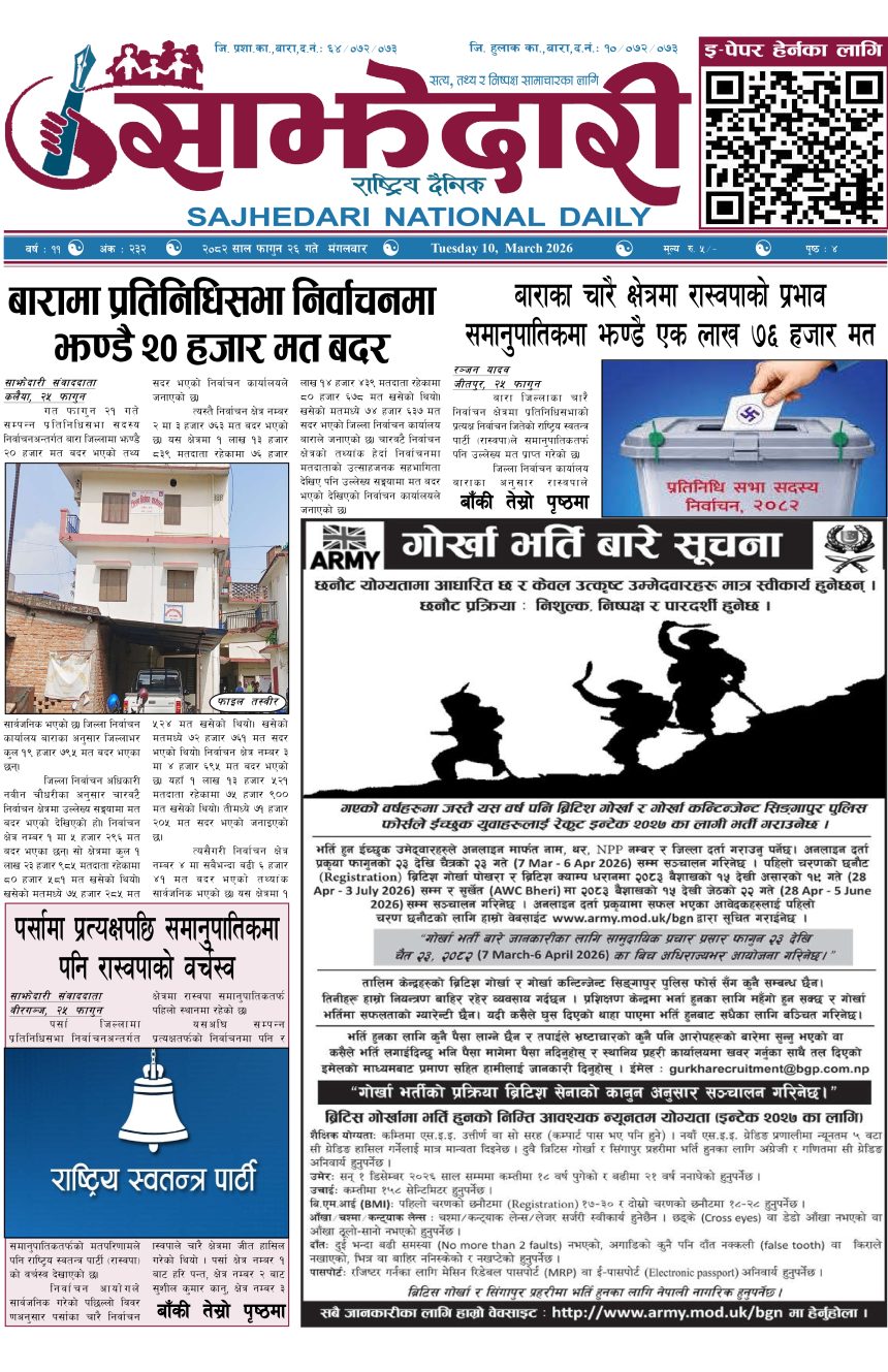ई–पेपर २०८२ फागुन २६ गते । साझेदारी दैनिक संदिप प्रसाद यादव २०८२ फाल्गुन २६, गते 222 पाठक संख्या शेयर शेयर Leave a review Leave a review Leave a Review Cancel replyYour email address will not be published. Required fields are marked * Please select a rating! Your Rating Rate… Perfect Good Average Not that Bad Very Poor Your Comment *नाम * Your Email * Your website Save my name, email, and website in this browser for the next time I comment. ताजा अपडेट सुनचाँदीको मूल्यमा केही गिरावट समाचार नहर अतिक्रमण हटाउन चार सय घरटहरा हटाइँदै मधेश मुख्य समाचार समाचार २०८३ वैशाख १७ गते । साझेदारी दैनिक ई–पेपर डाबर नेपाल अगाडि दुर्घटना : श्रीमान्को मृत्यु, श्रीमती गम्भीर मधेश समाचार यातायात कार्यालय कलैयाबाट भोलिदेखि स्मार्ट लाइसेन्स वितरण सुरु हुने मधेश मुख्य समाचार समाचार घरबारविहीनको व्यवस्थापनको जिम्मा सरकारले लिन्छः सभापति लामिछाने समाचार हावाहुरीका बेला चुँडिएका तार नछुन नेपाल विद्युत प्राधिकरण कलैया वितरण केन्द्रको चेतावनी मधेश समाचार मुख्य समाचार माधवनारायण नगरपालिकाको अत्याधुनिक प्रशासनिक भवन उद्घाटन मधेश समाचार वीरगन्ज हुँदै भित्रियो २६ अर्ब १३ करोडको सवारीसाधन र पार्टपुर्जा मधेश समाचार जितपुरमा प्रहरी इन्चार्जमाथि आर्थिक आतंकको आरोप ,व्यापारीदेखि ट्रान्सपोर्ट व्यवसायीसम्म त्रसित, मासिक लाखौं असुली हुने दाबी मधेश मुख्य समाचार समाचार प्रिन्ट भएको लाइसेन्स अझै नआएको भन्दै यातायात कार्यालय कलैयाको सूचना मधेश मुख्य समाचार समाचार रौतहटमा पूर्वाधार र पर्यटन कार्यालयविरुद्ध जसपाको कडा घेराबन्दी, चरम भ्रष्टाचार र कमिसनखोरीको आरोप मधेश समाचार प्रदेश समाचार वीरगञ्ज नाका हुँदै तीन अर्बको विद्युतीय सवारीसाधन आयात मधेश मुख्य समाचार समाचार जीतपुरसिमरा–६ मा वडा कार्यालय भवन उद्घाटन मधेश समाचार राष्ट्रिय स्वतन्त्र पार्टीको कलैया संयोजकमा उमाशंकर साह रौनियार चयन मधेश राजनीति समाचार परवानीपुरमा कृषि संकलन केन्द्र सञ्चालन, किसानलाई बजार सहज मधेश मुख्य समाचार समाचार सशस्त्र प्रहरी बल नम्बर ११ गण रौतहटद्वारा १९ औँ स्थापना दिवस भव्य रूपमा सम्पन्न मधेश समाचार