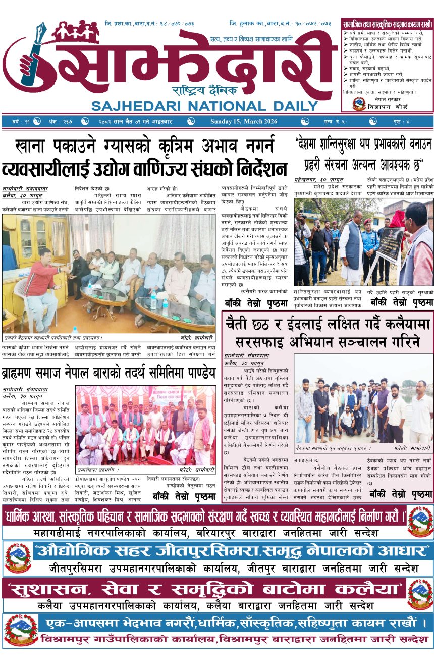 ई–पेपर २०८२ चैत ०१ गते । साझेदारी दैनिक संदिप प्रसाद यादव २०८२ चैत्र १, गते 169 पाठक संख्या शेयर शेयर Leave a review Leave a review Leave a Review Cancel replyYour email address will not be published. Required fields are marked * Please select a rating! Your Rating Rate… Perfect Good Average Not that Bad Very Poor Your Comment *नाम * Your Email * Your website Save my name, email, and website in this browser for the next time I comment. ताजा अपडेट रास्वपाको महामन्त्रीमा शाह मनोनित राजनीति समाचार पहिलेको निर्णय फेरियो : कलैयामा अब वैशाख १६ देखि कक्षा सुरु हुने मधेश मुख्य समाचार समाचार कलैयामा वैशाख १५ गतेदेखि भर्ना अभियान, २१ गतेदेखि पठनपाठन सुरु हुने मधेश मुख्य समाचार समाचार पेट्रोलियम पदार्थमा गरिएको मूल्य वृद्धि फिर्ता लिन अध्यक्ष घिसिङको माग समाचार पर्सा राष्ट्रिय निकुञ्जमा वन्यजन्तु उद्धार केन्द्र उद्घाटन मधेश समाचार कलैयामा खसी मासुको छालासहित र बिना छालाको छुट्टाछुट्टै मूल्य निर्धारण मधेश समाचार सिम्रौनगढमा छाडा कुकुरको आतंक : एकै घरका ८ खसी-बाख्रा मरे मधेश मुख्य समाचार समाचार मुख्य समाचार रेल्वे सेवा ७९ करोड ऋणमा मधेश समाचार सडक विस्तारले वीरगञ्जको विद्युत् अवरुद्ध मधेश मुख्य समाचार समाचार बाईपास विस्तारका लागि २४ घण्टाभित्र संरचना हटाउन वीरगञ्ज महानगरको निर्देशन मधेश मुख्य समाचार समाचार वीरगञ्जमा भर्ना अभियान वैशाख ७ गतेदेखि सुरु हुने मधेश समाचार वीरगन्जमा अतिक्रमित संरचना भत्काउन सुरु मधेश मुख्य समाचार समाचार प्रदेश समाचार जीतपुरसिमराको बिद्यालयमा पठनपाठन वैशाख १४ गते देखि सुरु हुने मधेश मुख्य समाचार समाचार करैयामाई -६ सिहोर्वामा नि:शुल्क स्वास्थ्य शिविर सम्पन्न मधेश समाचार स्वास्थ्य बारामा खेतबाट घर फर्किँदै गर्दा चट्याङ लागेर एक जनाको मृत्यु मधेश मुख्य समाचार समाचार बृन्दावनमा ६ सुकुम्बासी परिवार विस्थापित मधेश समाचार सुनसरीमा काँचो केरासहित चार जना पक्राउ मधेश मुख्य समाचार समाचार