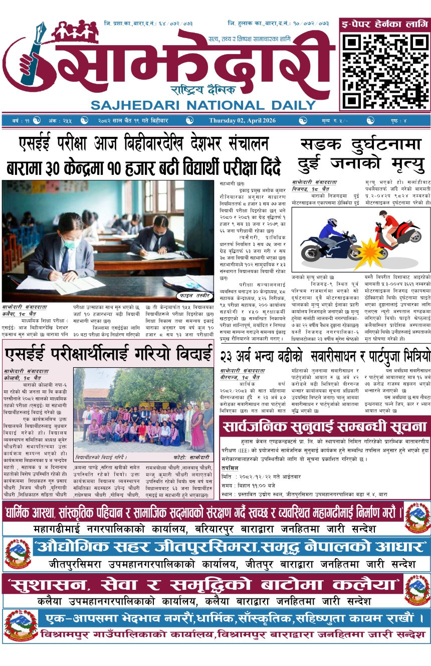 ई–पेपर २०८२ चैत १९ गते । साझेदारी दैनिक संदिप प्रसाद यादव २०८२ चैत्र १९, गते 129 पाठक संख्या शेयर शेयर Leave a review Leave a review Leave a Review Cancel replyYour email address will not be published. Required fields are marked * Please select a rating! Your Rating Rate… Perfect Good Average Not that Bad Very Poor Your Comment *नाम * Your Email * Your website Save my name, email, and website in this browser for the next time I comment. ताजा अपडेट होटेल करण राज प्यालेसमा आधुनिक सुविधासहित स्विमिङ पुल उद्घाटन मधेश मुख्य समाचार समाचार रिलायन्स सुगर एण्ड केमिकल इन्डस्ट्रिजद्वारा उखु क्रसिङ सिजन समापन मधेश मुख्य समाचार समाचार सिरहाको सलहेश फूलबारीमा भक्तजनको घुइँचो मधेश समाचार प्रसौनीमा ३ करोड भन्दा बढीको लागतमा विद्यालय–पुस्तकालय भवन निर्माण हुदै मधेश समाचार अवैध बिटौरी कर असुलीविरुद्ध प्रसौनीमा प्रदर्शन, छानबिनको माग मधेश मुख्य समाचार समाचार २०८३ वैशाख ०१ गते । साझेदारी दैनिक ई–पेपर प्रधानमन्त्री कप क्रिकेटः मधेसलाई पराजित गर्दै एपिएफ विजयी खेलकुद मधेश समाचार मुख्य समाचार पर्सामा लागुऔषध गाँजाजस्तो देखिने पदार्थसहित एक जना पक्राउ मधेश समाचार चौरसिया हत्या प्रकरणमा चार जना पक्राउ मधेश मुख्य समाचार समाचार रोकिएन राजमार्गमा ढाट राखेर सङ्कलन गरिने अवैध कर मधेश समाचार बारामा एसईईको उत्तरपुस्तिका परीक्षण कार्य सम्पन्न, नतिजा आजै बोर्डमा पठाइँदै मधेश मुख्य समाचार समाचार बकुलिया विद्यालयमा सामाजिक परीक्षण कार्यक्रम सम्पन्न मधेश समाचार प्रदेश समाचार प्रेस युनियनद्धारा स्थानीय मिडिया बचाउन सरकारसंग नीतिगत स्पष्टता ल्याउन माग मधेश मुख्य समाचार समाचार उन्नाइस केजी गाँजासहित युवक पक्राउ मधेश समाचार रौतहटमा नागरिक सुनुवाइ कार्यक्रम सम्पन्न मधेश मुख्य समाचार समाचार रास्वपा सदस्यले गल्ति गरे कारवाही हुन्छ : मधेस प्रदेश सभापति यादव मधेश मुख्य समाचार राजनीति समाचार जेनजी युथ अफ बाराद्वारा प्रादेशिक अस्पताल कलैयामा बृहत् सरसफाइ मधेश समाचार स्वास्थ्य