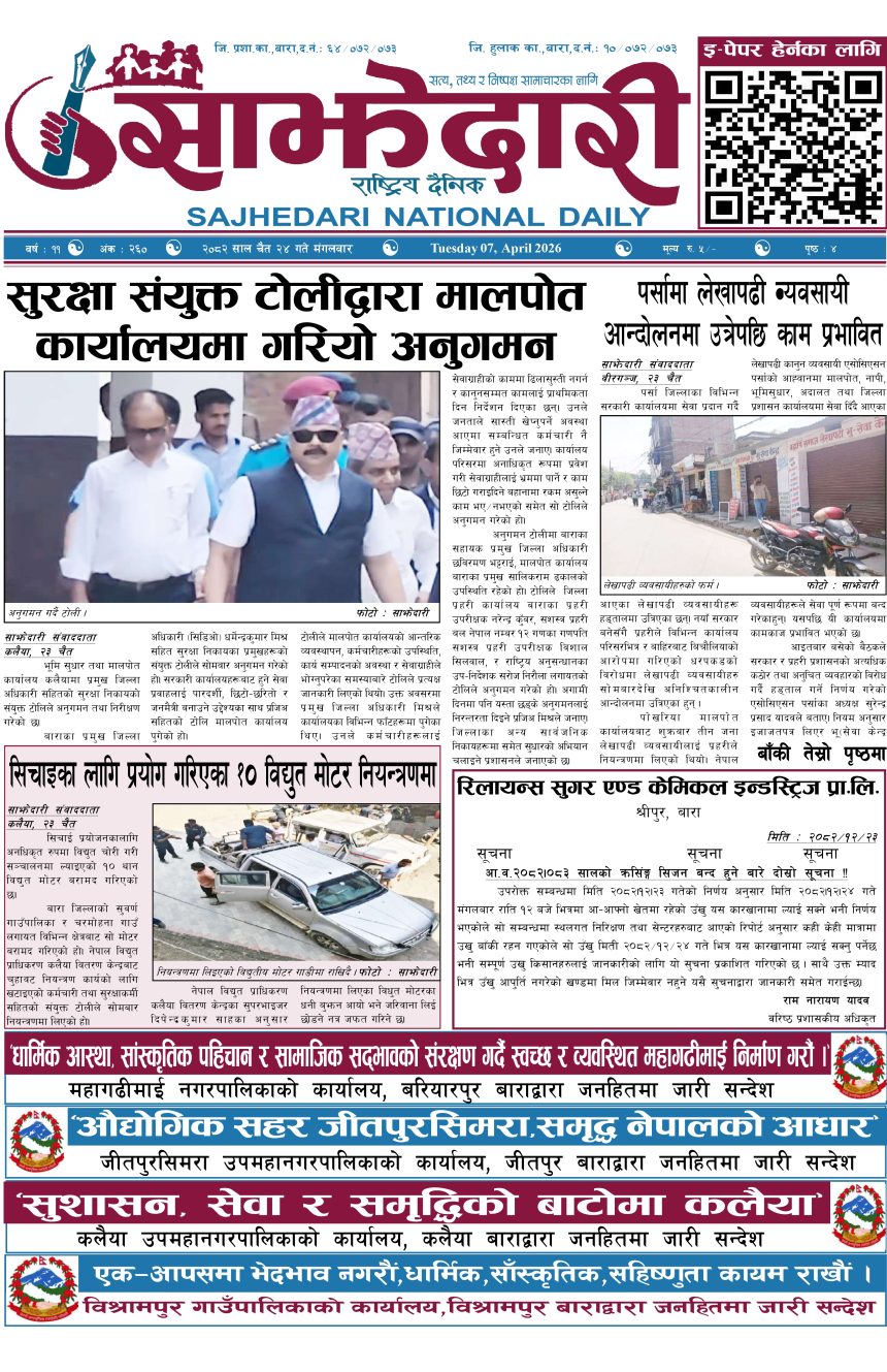 ई–पेपर २०८२ चैत २४ गते । साझेदारी दैनिक संदिप प्रसाद यादव २०८२ चैत्र २४, गते 144 पाठक संख्या शेयर शेयर Leave a review Leave a review Leave a Review Cancel replyYour email address will not be published. Required fields are marked * Please select a rating! Your Rating Rate… Perfect Good Average Not that Bad Very Poor Your Comment *नाम * Your Email * Your website Save my name, email, and website in this browser for the next time I comment. ताजा अपडेट होटेल करण राज प्यालेसमा आधुनिक सुविधासहित स्विमिङ पुल उद्घाटन मधेश मुख्य समाचार समाचार रिलायन्स सुगर एण्ड केमिकल इन्डस्ट्रिजद्वारा उखु क्रसिङ सिजन समापन मधेश मुख्य समाचार समाचार सिरहाको सलहेश फूलबारीमा भक्तजनको घुइँचो मधेश समाचार प्रसौनीमा ३ करोड भन्दा बढीको लागतमा विद्यालय–पुस्तकालय भवन निर्माण हुदै मधेश समाचार अवैध बिटौरी कर असुलीविरुद्ध प्रसौनीमा प्रदर्शन, छानबिनको माग मधेश मुख्य समाचार समाचार २०८३ वैशाख ०१ गते । साझेदारी दैनिक ई–पेपर प्रधानमन्त्री कप क्रिकेटः मधेसलाई पराजित गर्दै एपिएफ विजयी खेलकुद मधेश समाचार मुख्य समाचार पर्सामा लागुऔषध गाँजाजस्तो देखिने पदार्थसहित एक जना पक्राउ मधेश समाचार चौरसिया हत्या प्रकरणमा चार जना पक्राउ मधेश मुख्य समाचार समाचार रोकिएन राजमार्गमा ढाट राखेर सङ्कलन गरिने अवैध कर मधेश समाचार बारामा एसईईको उत्तरपुस्तिका परीक्षण कार्य सम्पन्न, नतिजा आजै बोर्डमा पठाइँदै मधेश मुख्य समाचार समाचार बकुलिया विद्यालयमा सामाजिक परीक्षण कार्यक्रम सम्पन्न मधेश समाचार प्रदेश समाचार प्रेस युनियनद्धारा स्थानीय मिडिया बचाउन सरकारसंग नीतिगत स्पष्टता ल्याउन माग मधेश मुख्य समाचार समाचार उन्नाइस केजी गाँजासहित युवक पक्राउ मधेश समाचार रौतहटमा नागरिक सुनुवाइ कार्यक्रम सम्पन्न मधेश मुख्य समाचार समाचार रास्वपा सदस्यले गल्ति गरे कारवाही हुन्छ : मधेस प्रदेश सभापति यादव मधेश मुख्य समाचार राजनीति समाचार जेनजी युथ अफ बाराद्वारा प्रादेशिक अस्पताल कलैयामा बृहत् सरसफाइ मधेश समाचार स्वास्थ्य