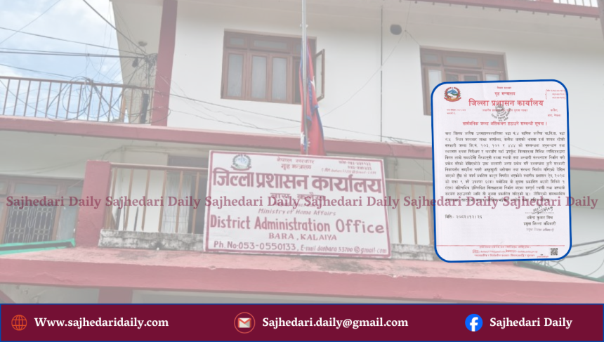 कलैया । बारामा कारागार शाखाको नाममा दर्ता रहेको सरकारी जग्गामा भएको अतिक्रमण हटाउन जिल्ला प्रशासन कार्यालय बाराले सूचना जारी गरेको छ। जिल्ला प्रशासन कार्यालय बाराका प्रमुख जिल्ला अधिकारी धर्मेन्द्र कुमार मिश्रले सार्वजनिक जग्गा अतिक्रमण हटाउन आज सूचना जारी गरेका हुन्।