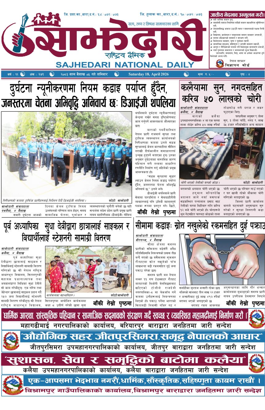 ई–पेपर २०८३ वैशाख ०५ गते । साझेदारी दैनिक संदिप प्रसाद यादव २०८३ बैशाख ५, गते 50 पाठक संख्या शेयर शेयर Leave a review Leave a review Leave a Review Cancel replyYour email address will not be published. Required fields are marked * Please select a rating! Your Rating Rate… Perfect Good Average Not that Bad Very Poor Your Comment *नाम * Your Email * Your website Save my name, email, and website in this browser for the next time I comment. ताजा अपडेट दुर्घटना न्यूनीकरणलाई केन्द्रमा राखेर काम गर्न डीआईजी थपलियाको निर्देशन मधेश मुख्य समाचार समाचार कलैयामा घरको ताला तोडेर करिब ५० लाख बराबरको चोरी मधेश मुख्य समाचार समाचार प्रधानमन्त्री कप क्रिकेटको उपाधि त्रिभुवन आर्मी क्लबलाई खेलकुद मधेश मुख्य समाचार समाचार लागुऔषधसहित विभिन्न स्थानबाट २४ जना पक्राउ प्रदेश समाचार समाचार सुनचाँदीको मूल्य घट्यो समाचार भन्सार छली प्रकरणः तीन जनाविरुद्ध अदालतमा मुद्दा, मुख्य अभियुक्तबाट २ करोडभन्दा बढी बिगो दाबी मधेश मुख्य समाचार समाचार जीतपुरको गौशाला जग्गा अतिक्रमण घरटहरा हटाइयो मधेश मुख्य समाचार समाचार मुख्य समाचार बारामा भूतपूर्व सैनिक पुनर्मिलन कार्यक्रम सम्पन्न मधेश समाचार पाँच पटक भन्दाबढी ट्राफिक नियम उल्लंघन गर्नेको लाइसेन्स निलम्बन प्रक्रिया सुरु मधेश मुख्य समाचार समाचार बाराका दुई नगरपालिकामा नयाँ प्रमुख प्रशासकीय अधिकृत खटाइए मधेश मुख्य समाचार समाचार पर्सामा नागरिकतासँगै राष्ट्रिय परिचयपत्र मधेश मुख्य समाचार समाचार राजश्व अनुसन्धान कार्यालय पथलैयामा आगलागी, प्रमुखको कार्यकक्ष ध्वस्त मधेश समाचार प्रदेश समाचार भाडा वृद्धि पछि सिमरा-काठमाडौं उडानमा यात्रु घटे मधेश मुख्य समाचार समाचार बारामा साढे दुई महिनामा एक करोडभन्दा बढीको अवैध सामान बरामद मधेश मुख्य समाचार समाचार सांसद साहलाई जीतपुरसिमरा-१७ का वडाबासीद्वारा ध्यानाकर्षणपत्र बुझाइयो मधेश मुख्य समाचार समाचार प्रधानमन्त्री कपको आजको खेलमा मधेस प्रदेश विजयी खेलकुद मधेश समाचार स्थानीय तहसँग मागियो विद्यालय समायोजनको विवरण प्रदेश समाचार समाचार