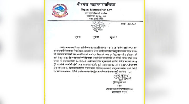 वीरगञ्ज । पर्साको वीरगञ्ज महानगरपालिकाले बाईपास सडक विस्तारका लागि सडक क्षेत्रभित्र रहेका संरचना हटाउन सर्वसाधारणलाई आग्रह गरेको छ।