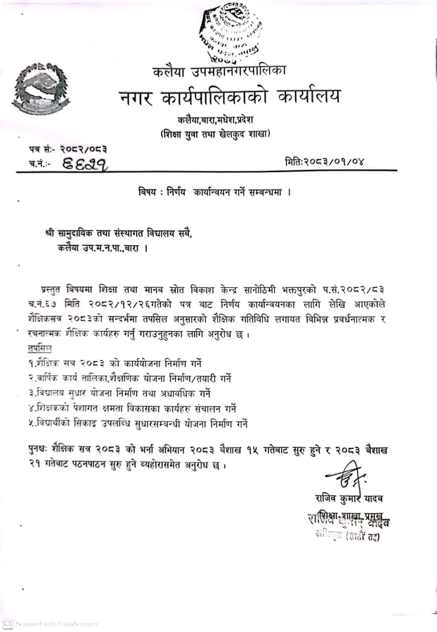 नगर प्रमुखको आदेशानुसार नगरपालिकाको शिक्षा, युवा तथा खेलकुद शाखाले आज एक सूचना जारी गर्दै नगर क्षेत्रका सम्पूर्ण सामुदायिक तथा संस्थागत विद्यालयहरूलाई नयाँ सत्रको तयारीका लागि निर्देशन दिएको हो।
