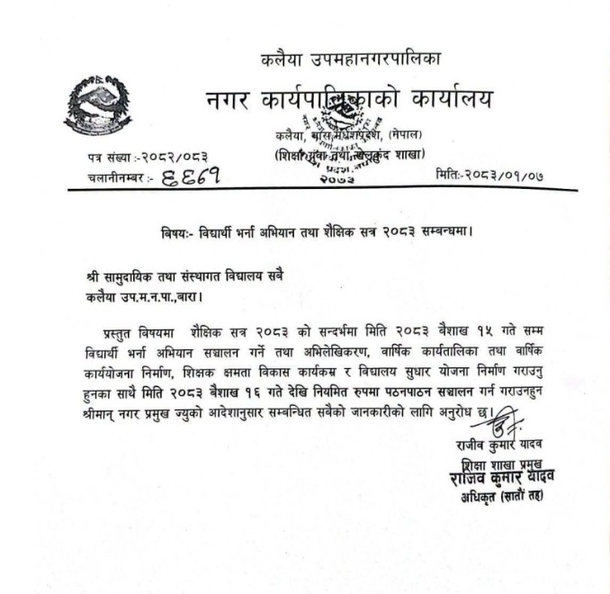 बारा । बाराको कलैया उपमहानगरपालिकाले आगामी शैक्षिक सत्र २०८३ का लागि विद्यार्थी भर्ना अभियान तथा विद्यालय सञ्चालन सम्बन्धी नयाँ कार्यतालिका सार्वजनिक गरेको छ।