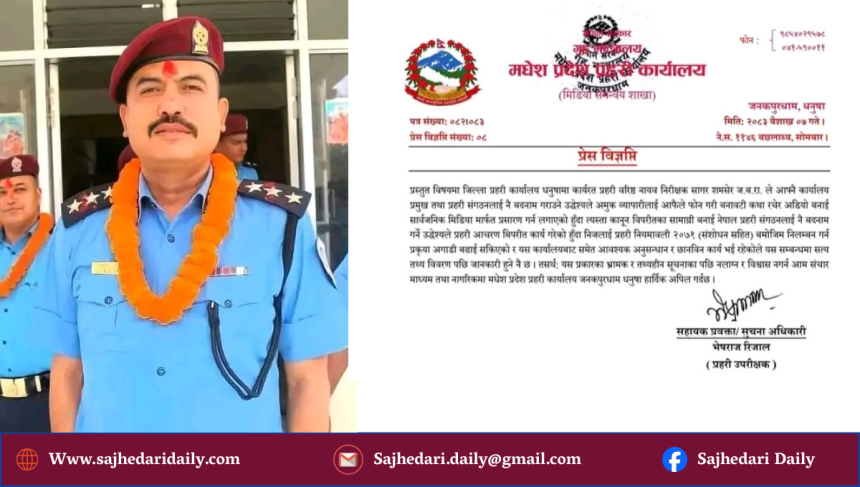 कलैया । मधेश प्रदेश प्रहरी कार्यालय जनकपुरधामले जिल्ला प्रहरी कार्यालय धनुषामा कार्यरत प्रहरी वरिष्ठ नायव निरीक्षक सागर शमसेर ज.ब.रा.माथि बनावटी अडियो तयार गरी कार्यालय प्रमुख तथा प्रहरी संगठनलाई बदनाम गराउने प्रयास गरेको आरोप लगाउँदै निलम्बन प्रक्रिया अगाडि बढाएको छ।