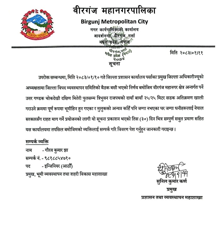 जिल्ला प्रशासन कार्यालय पर्साका प्रमुख जिल्ला अधिकारीको अध्यक्षतामा बसेको जिल्ला विपद् व्यवस्थापन समितिको निर्णयअनुसार उत्तर गण्डक चोकदेखि दक्षिण मितेरी पुलसम्मको सडक क्षेत्रमा पर्ने २५/२५ मिटर अतिक्रमण हटाउने क्रममा पूर्ण रूपमा भूमिहीन भएका तथा देशका अन्य कुनै पनि स्थानमा जग्गा नभएका घरधनीहरूलाई लक्षित गरी सूचना जारी गरिएको हो।