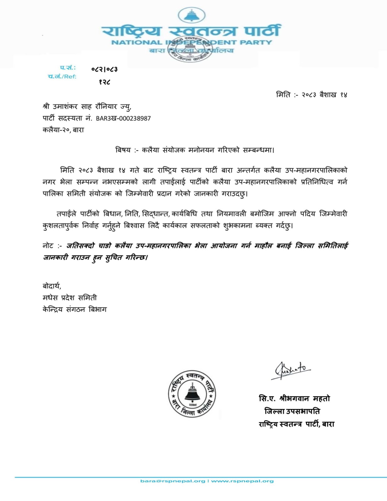 पार्टीको बिधान, नीति, सिद्धान्त, कार्यबिधि तथा नियमावली बमोजिम आफ्नो पदीय जिम्मेवारी कुशलतापूर्वक निर्वाह गर्नेे बिश्वास लिदै कार्यकाल सफलताको शुभकामना महतोले ब्यक्त गरेका छन्। जतिसक्दो चाडो कलैया उप–महानगरपालिका भेला आयोजना गर्न माहौल बनाई जिल्ला समितिलाई जानकारी गराउन हुन समेत मनोनयन पत्रमा लेखिएको छ।