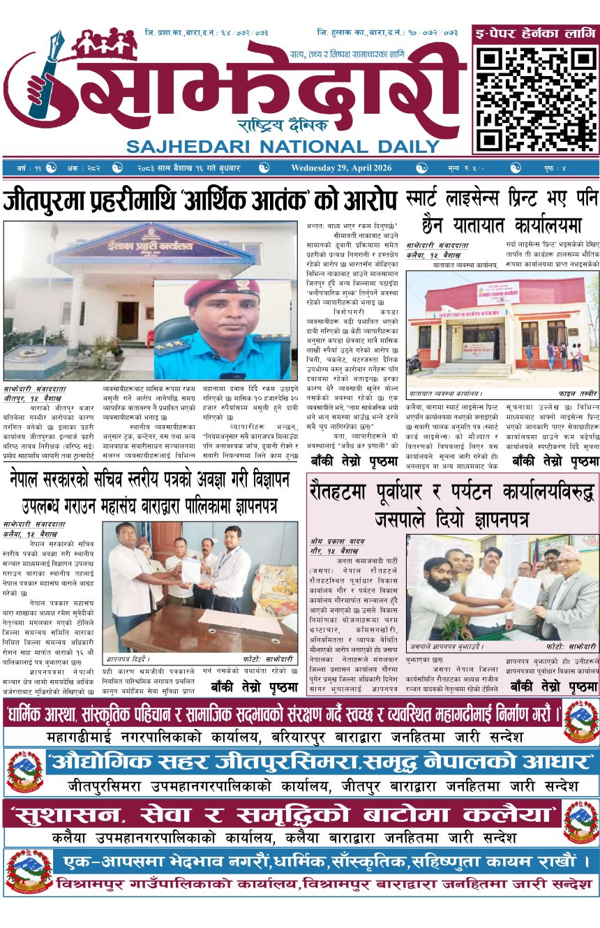 ई–पेपर २०८३ वैशाख १६ गते । साझेदारी दैनिक संदिप प्रसाद यादव २०८३ बैशाख १६, गते 61 पाठक संख्या शेयर शेयर Leave a review Leave a review Leave a Review Cancel replyYour email address will not be published. Required fields are marked * Please select a rating! Your Rating Rate… Perfect Good Average Not that Bad Very Poor Your Comment *नाम * Your Email * Your website Save my name, email, and website in this browser for the next time I comment. ताजा अपडेट जितपुरमा प्रहरी इन्चार्जमाथि आर्थिक आतंकको आरोप ,व्यापारीदेखि ट्रान्सपोर्ट व्यवसायीसम्म त्रसित, मासिक लाखौं असुली हुने दाबी मधेश मुख्य समाचार समाचार प्रिन्ट भएको लाइसेन्स अझै नआएको भन्दै यातायात कार्यालय कलैयाको सूचना मधेश मुख्य समाचार समाचार रौतहटमा पूर्वाधार र पर्यटन कार्यालयविरुद्ध जसपाको कडा घेराबन्दी, चरम भ्रष्टाचार र कमिसनखोरीको आरोप मधेश समाचार वीरगञ्ज नाका हुँदै तीन अर्बको विद्युतीय सवारीसाधन आयात मधेश मुख्य समाचार समाचार प्रमाणबिनै आरोप: घाटामा डुबेका लगानीकर्ता राजबहादुर विवादमा अर्थ / वाणिज्य समाचार जीतपुरसिमरा–६ मा वडा कार्यालय भवन उद्घाटन मधेश समाचार राष्ट्रिय स्वतन्त्र पार्टीको कलैया संयोजकमा उमाशंकर साह रौनियार चयन मधेश राजनीति समाचार मुख्य समाचार परवानीपुरमा कृषि संकलन केन्द्र सञ्चालन, किसानलाई बजार सहज मधेश मुख्य समाचार समाचार सशस्त्र प्रहरी बल नम्बर ११ गण रौतहटद्वारा १९ औँ स्थापना दिवस भव्य रूपमा सम्पन्न मधेश समाचार हावाहुरी र असिनाले निलकण्ठवामा ३ घरमा क्षति मधेश मुख्य समाचार समाचार रौतहटमा गुणस्तरहीन निर्माण कार्य भएको भन्दै स्थानीयद्वारा विरोध ,काका ठेकेदार भतिजा ईन्जिनियर मधेश मुख्य समाचार समाचार गण्डक नहर किनारका अतिक्रमित संरचना हटाउन थालियो मधेश समाचार प्रदेश समाचार कलैया : बसपार्कबाटै सवारी चलाउने निर्णय अझै कार्यान्वयन भएन मधेश मुख्य समाचार समाचार खुला नाकाबाट सोझै वीरगन्ज भित्रिन्छ भारतीय तरकारी मधेश समाचार मधुवनमा काठसहित एक जना पक्राउ मधेश समाचार सेज क्षेत्रको अतिक्रमण हटाउने प्रक्रिया तीव्र हुँदै,५ सय बिघा जमिन फिर्ता लिन सरकारको दबाब मधेश मुख्य समाचार समाचार कलवारको नेतृत्वमा शान्ति युवा मञ्चको नयाँ समिति गठन मधेश समाचार